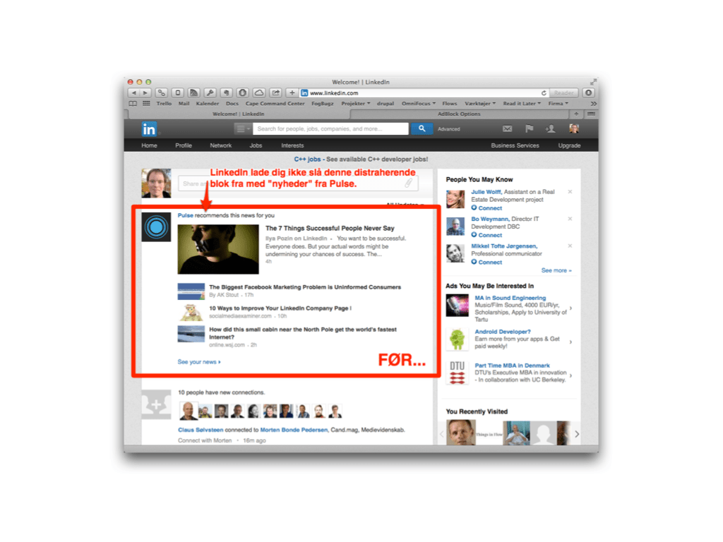 Er du også træt af blokken med ligegyldige nyheder fra Pulse, som bliver vist øverst på din LinkedIn-profilside – og som LinkedIn ikke giver dig lov til at slå fra? Her er opskriften på hvordan du selv kan fjerne den, så du atter kan fokusere på det du kom efter, nemlig dine kontakters updates.