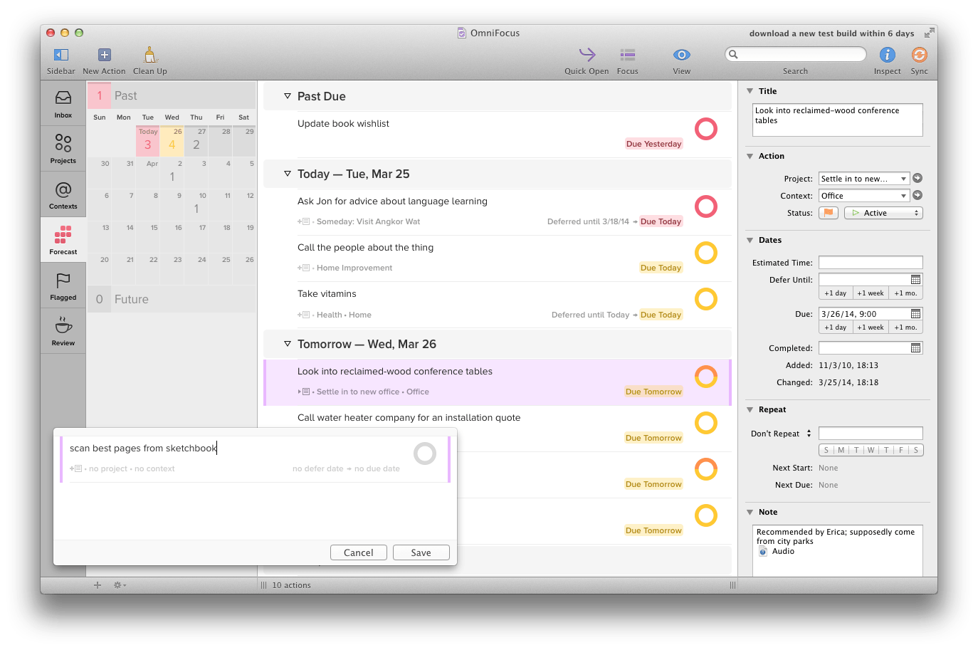 For et par uger siden beskrev jeg her på thingsinflow.dk, hvordan den længe ventede version 2 af Getting Things Done-programmet OmniFocus for Mac nu endelig er klar. Og om hvordan lanceringen var lidt af en begivenhed i GTD-kredse, fordi så mange hard core GTD’ister bruger eller har brugt netop dette program i stor stil. Men hvordan er den nye version så at bruge i praksis? Og kan den leve op til hypen? Det er emnet for dette blogindlæg. Læs videre “Anmeldelse: Sådan er OmniFocus 2 i praksis”